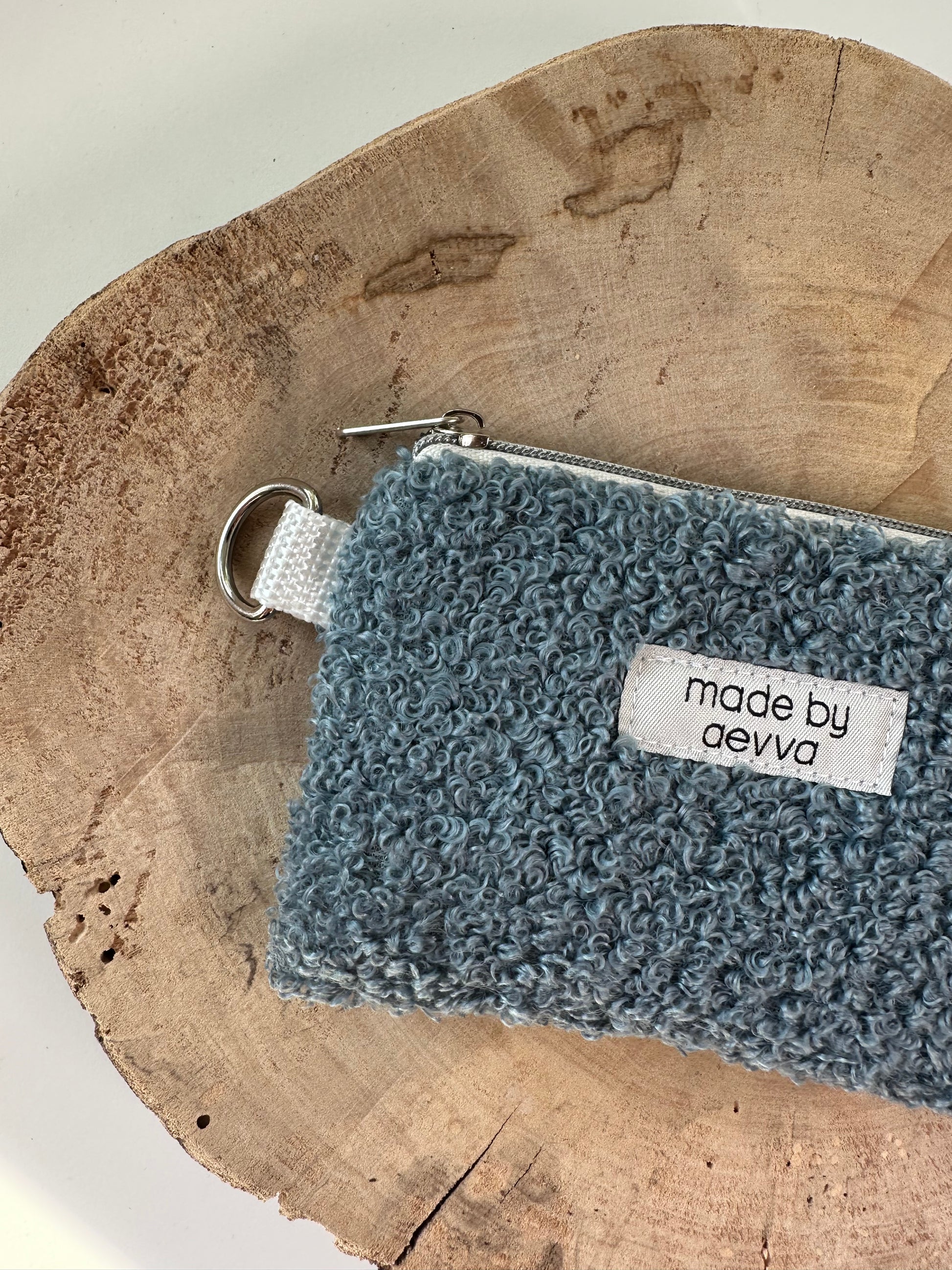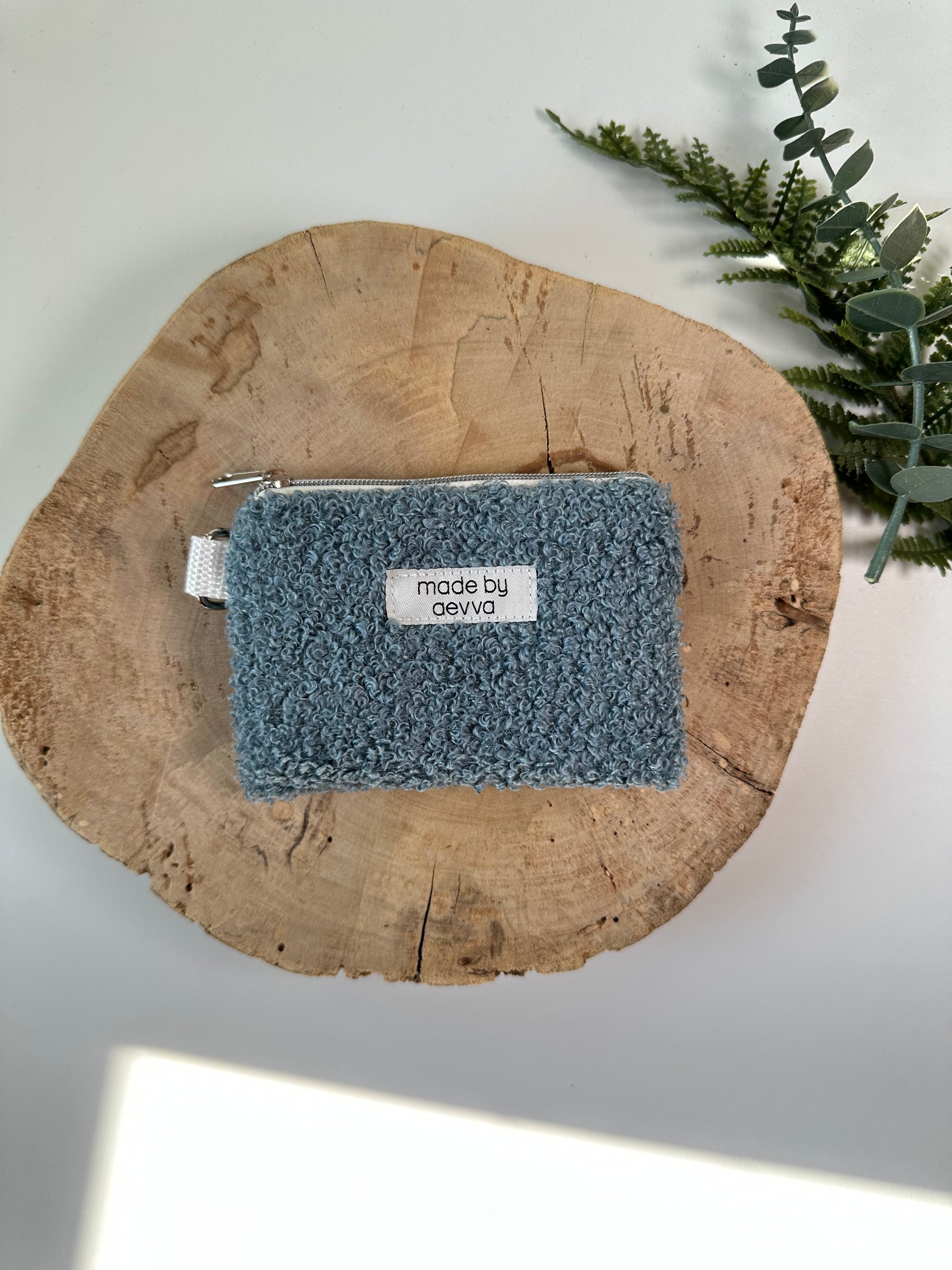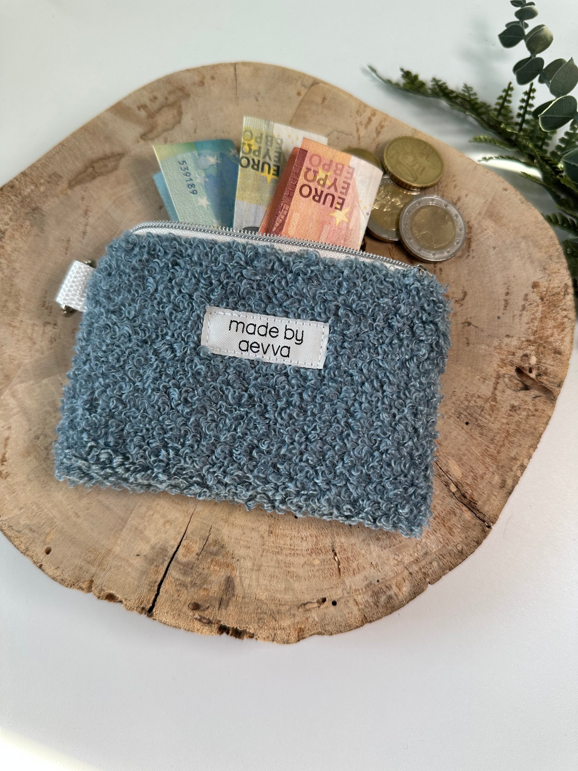 Dieser kompakte Mini-Geldbeutel aus weichem Teddystoff in einem hellblau ist der ideale Begleiter für deinen Alltag.